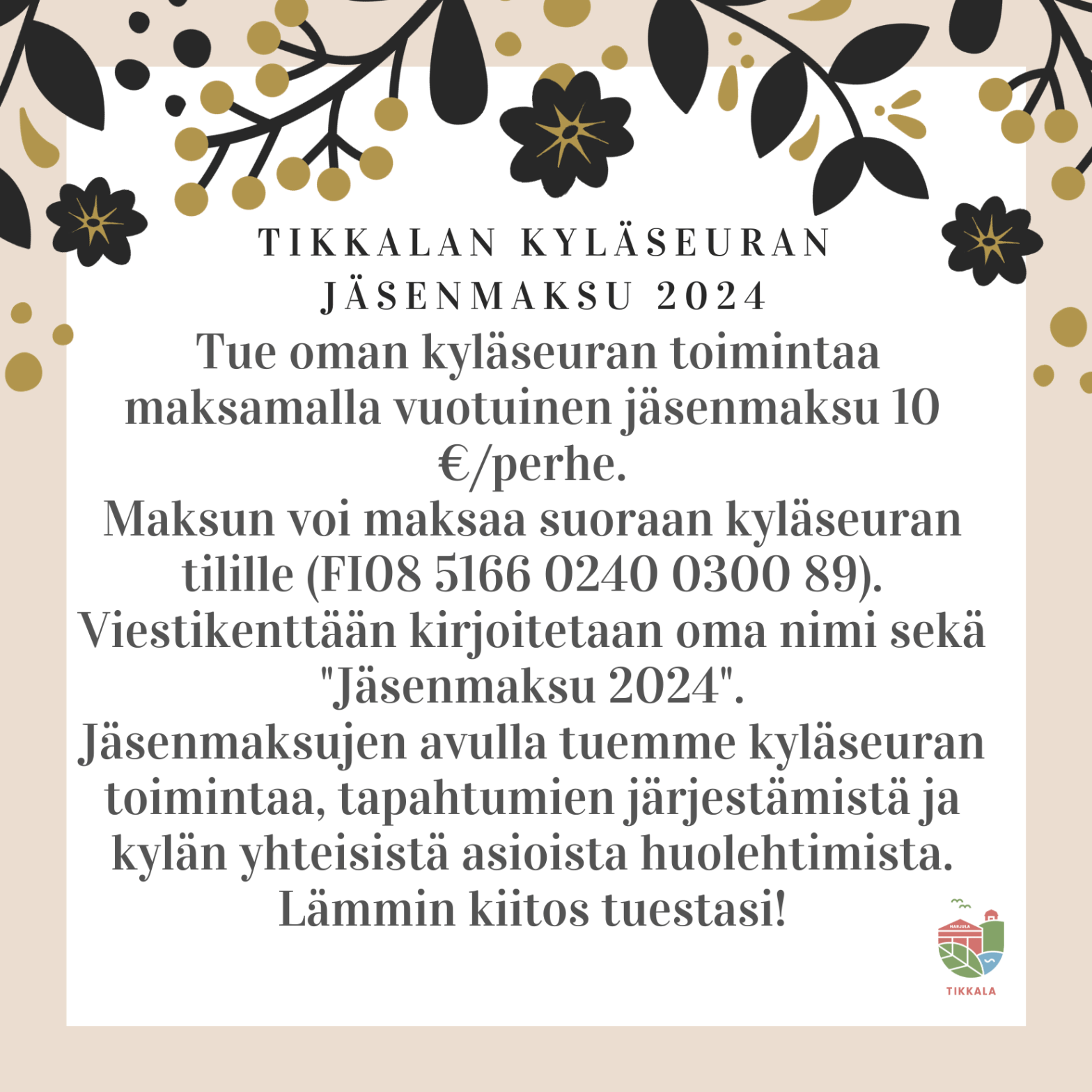 Hei kaikki ja hyvää uutta vuotta! Tämän vuoden iso ponnistus on Harjulan sisäilmaremontti, jota varten keräämme varoja ja tekijöitä talkoisiin, toivottavasti sinulta liikenee molempia, yhteiseksi hyväksi. Jäsenmaksu on ruokakuntakohtainen, ilmoita viitteessä kaikkien jäsenten nimet ja osoite.