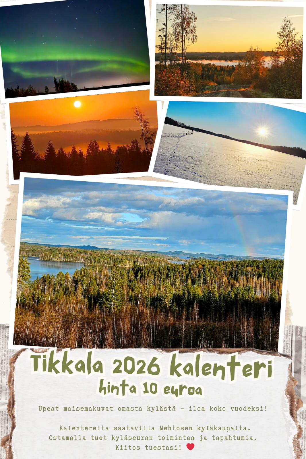 Tikkalan vuosikalenteri 2026 nyt saatavilla! Kirjoittanutrla17481.12.2025Kategoria(t):Yleinen Kalenterin hinta on 10 €/kpl, myynnissä Mehtosen kaupalla. Jaa: Click to share on X(Avautuu uudessa ikkunassa) X Jaa Facebookissa(Avautuu uudessa ikkunassa) Facebook Tykkää Lataa...